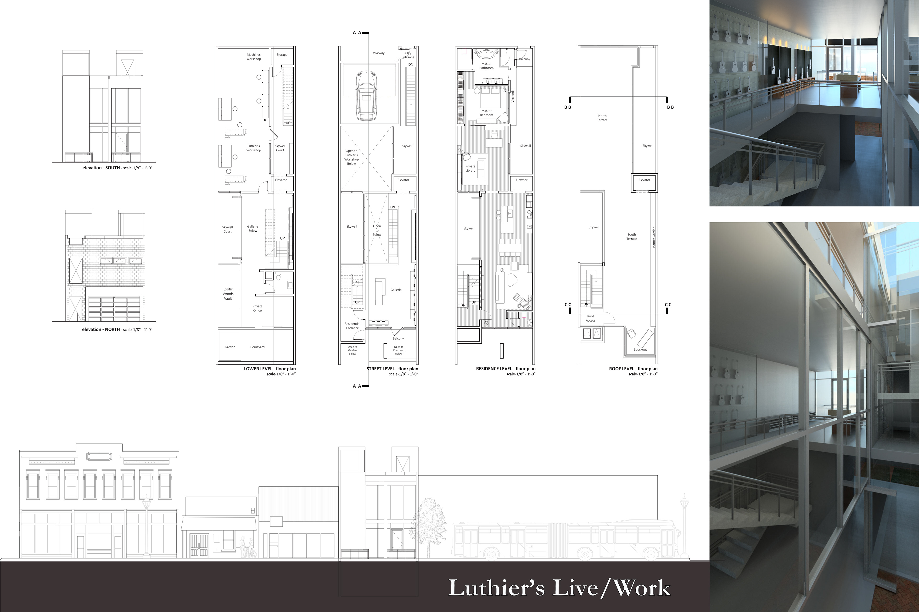 Luthier’s Live/Work Pad Urban Infill Project | Albuquerque, New Mexico Type: Mixed-use (Residential + Workshop + Gallery) Role: Designer | Academic Studio Project | UNM School of Architecture ________________________________________ Project Narrative This live/work residence was designed for a master luthier—a celebrated maker of stringed instruments—within a dense urban corner lot in downtown Albuquerque. The project explores the interplay between craft, culture, and urban living, blending public and private program elements across a narrow, 25' x 100' site. Located across from the National Institute of Flamenco, the project responds to a vibrant artistic context. The client is imagined as an affluent craftsman and occasional performer, who needs both workspace and public-facing display zones within a home that still offers privacy and retreat. ________________________________________ Design Strategy The design concept draws inspiration from the traditional Spanish-Colonial balcony (El Balcón), reinterpreted here as a gallery window—projecting crafted instruments to the street as cultural artifacts. The architectural language celebrates volume, materiality, and filtered light, carving into the urban fabric with a mix of civic presence and intimate scale. ________________________________________ Spatial Organization • South Zone: Living room, office, rooftop terrace • Center Core: Workshop, kitchen, personal library • North Zone: Bedroom suite, secondary workspace, garage Double-height spaces and open thresholds between program areas allow for visual continuity and flexibility of use—ideal for performances, exhibitions, or quiet craft. ________________________________________ Design Highlights • Civic expression through a gallery/storefront condition • Daylight as organizer, informed by solar orientation • Vertical stacking for efficient use of narrow infill lot • Material contrast to articulate public vs private identity ________________________________________ Reflection The Luthier’s Live/Work Pad is both a home and a performance, honoring the client’s legacy while engaging the surrounding community. It bridges tradition and innovation, merging private craft with public art in a structure that belongs to both its street and its story.
